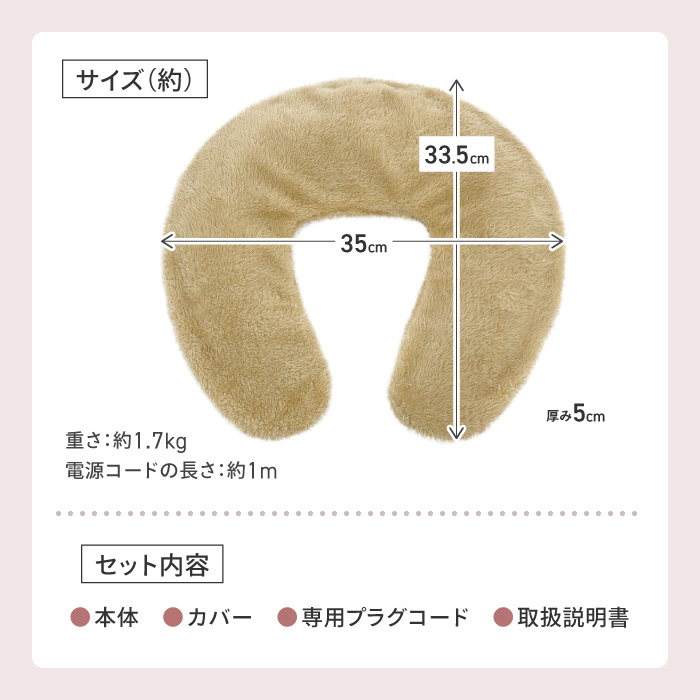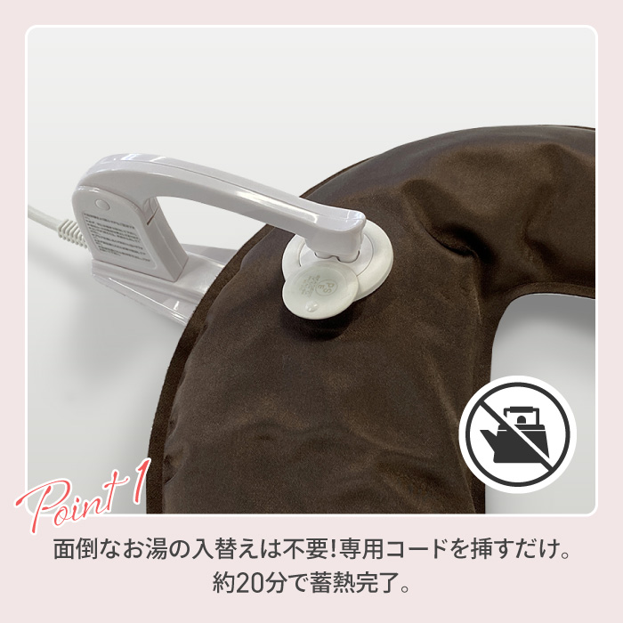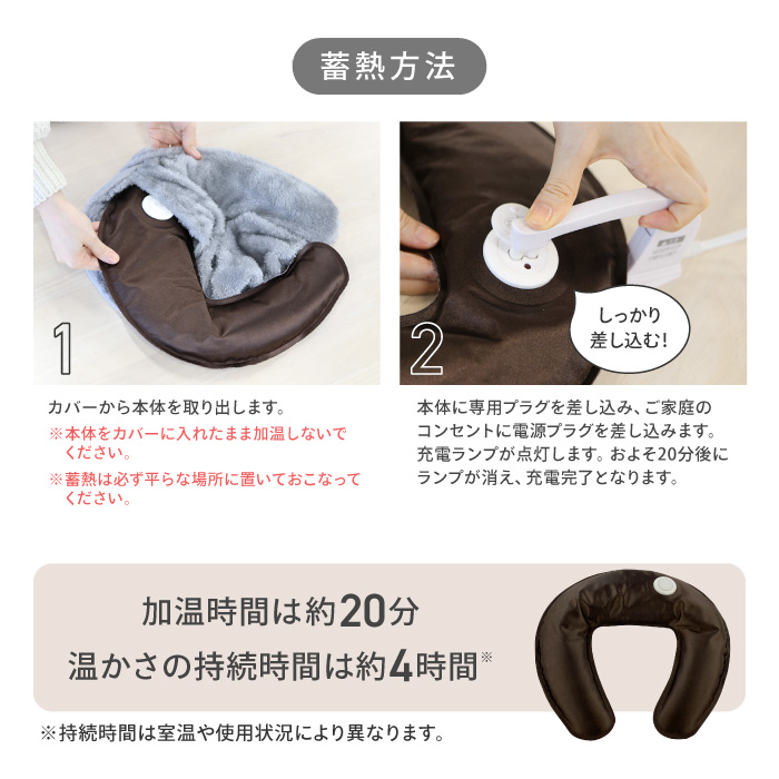●首と肩をやさしく温める蓄熱式湯たんぽ。 ●面倒なお湯の入替えは不要!専用コードを挿すだけ。約20分で蓄熱完了。 ●最長4時間温かさが持続します。 ●程よい重み(約1.7kg)でしっかりフィット ●ふわふわした毛並みのカバー ●コードレスだからどこでも持ち運び可能で繰り返し使用できます。 ●PSEマーク認証済商品 |